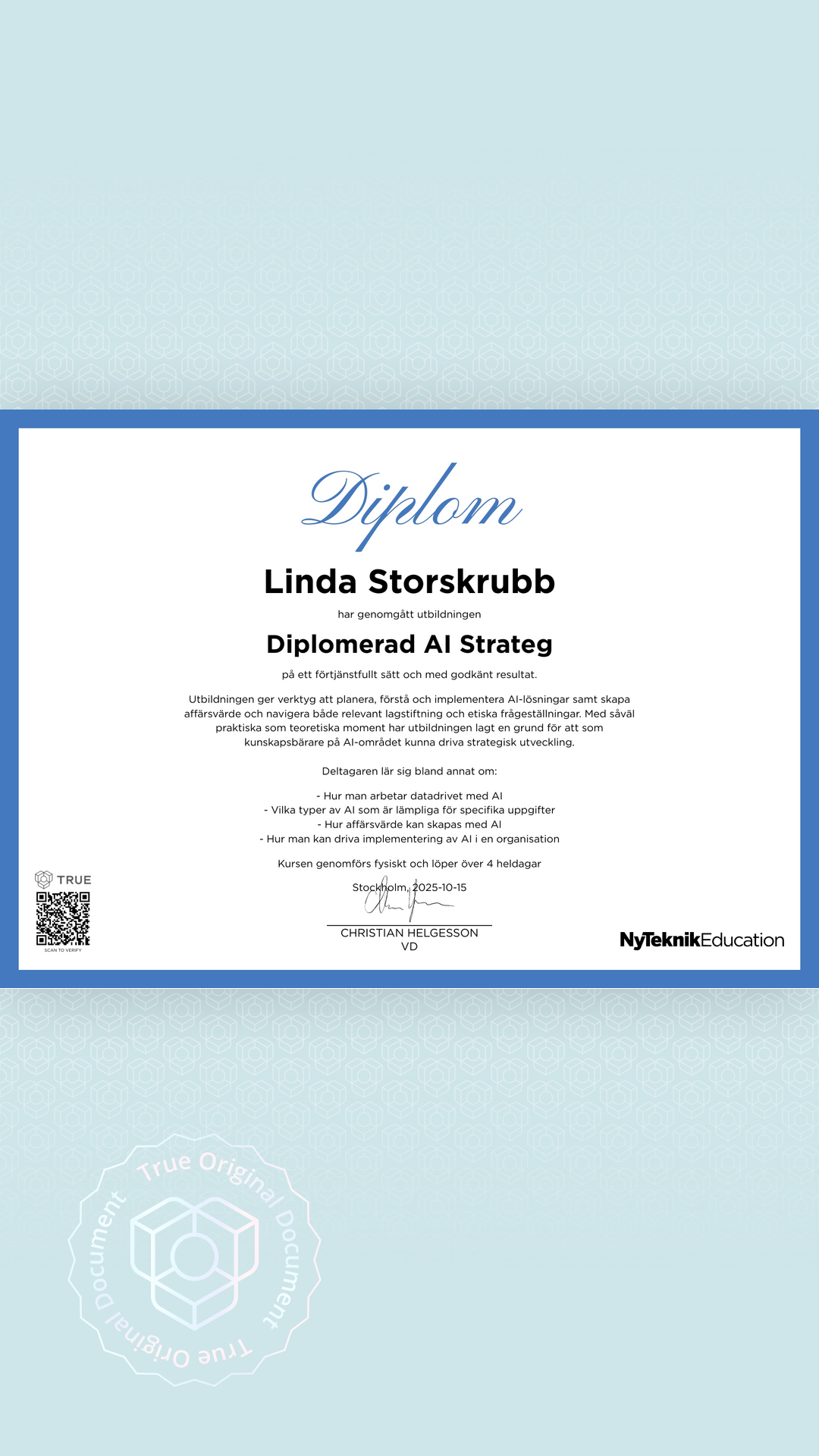 Alla TRUE -document är säkrade med blockchain-teknologi och kan verifieras som äkta. Klicka på verifieringsknappen bredvid dokumentet eller skanna QR-koden med din smartphones kamera. Ingen app krävs - dokumentets äkthet verifieras omedelbart.