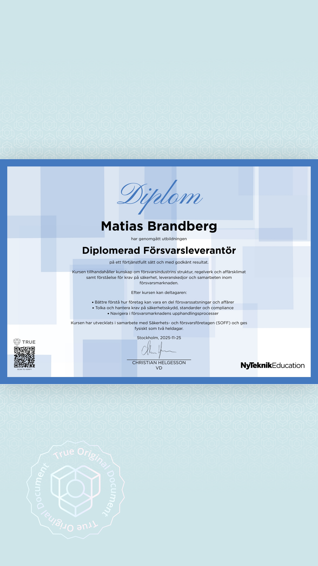 Alla TRUE -document är säkrade med blockchain-teknologi och kan verifieras som äkta. Klicka på verifieringsknappen bredvid dokumentet eller skanna QR-koden med din smartphones kamera. Ingen app krävs - dokumentets äkthet verifieras omedelbart.